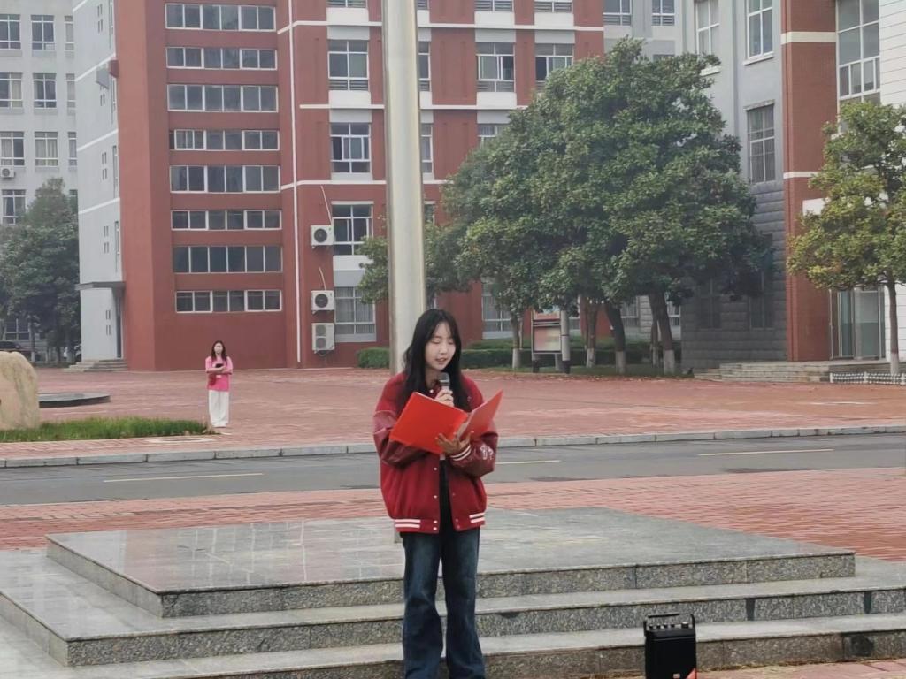 升旗仪式结束后,学生代表冯甜甜发言。党的二十大报告中指出“要促进群众体育和竞技体育全面发展,加快建设体育强国”。广大青年学子要树立团结协作、顽强拼搏的体育精神,在学习生活中彰显体育运动的重要性和紧迫性,一以贯之落实到行动中。
