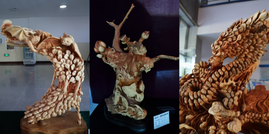 一件件根雕作品仿佛在诉说着古老的故事,它们或栩栩如生,或意境深远,无不展现出大师的精湛技艺和独特匠心。杨玉升大师在讲解过程中,还分享了自己在创作过程中的心得与感悟,让师生们对根雕艺术有了更深入的理解。