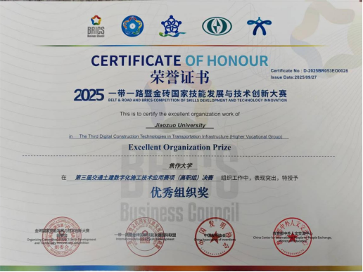 此次赛事成绩的取得,离不开学校领导的高度重视与相关部门的全力支持。赛前,学校不仅为参赛团队配备了专业指导力量、提供了优质实训设备与场地保障,还通过统筹协调教学资源、组织经验交流活动为备赛工作保驾护航;赛后,我校因组织有序、表现突出,同步荣获“优秀组织奖”,这既是对师生努力的肯定,更是对学校专业建设与技能人才培养工作的认可。未来,我校将以此次赛事为契机,持续深化交通土建领域数字化教学改革,加强高水平技能人才培养,为服务行业发展与国家 “一带一路” 建设贡献更多力量。