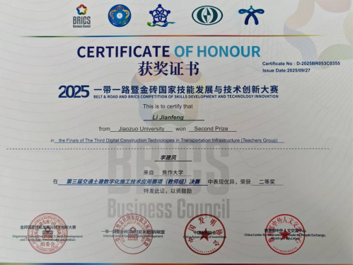 2025年9月27日,一带一路暨金砖国家技能发展与技术创新大赛第三届交通土建数字化施工技术应用赛项圆满落幕,我院师生凭借扎实的专业素养与出色的实践能力脱颖而出,学生组翁浩峰、宋全崟同学,教师组李建凤老师均斩获二等奖,为学校赢得了荣誉。