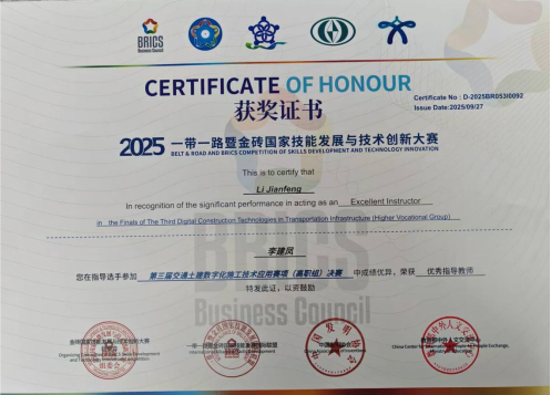 作为聚焦“一带一路” 与金砖国家技能合作、服务交通土建行业数字化转型的高水平赛事,本次大赛由金砖国家工商理事会中国理事会主办,汇聚了全国多所院校的师生代表队同台竞技,是检验院校交通土建数字化教学成果、推动产教融合与国际技能交流的重要平台。为在赛事中展现我校实力,学院通过选拔指导教师、参赛学生,组建了由李建凤作为指导教师,翁浩峰、宋全崟作为参赛选手的参赛队伍。自备赛以来,师生团队历时六个月深耕细作,围绕交通土建数字化施工核心技术反复打磨方案、开展模拟实训,在激烈竞争中成功拿下二等奖,充分彰显了我校在交通土建专业人才培养与教师技术能力建设上的扎实成效。