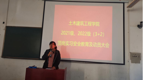会议第一项由副院长王敏向全体学生讲解顶岗实习的具体安排,主要介绍了实习性质和目的、实习时间、实习注意事项、实习成果及实习成绩认定五个方面。