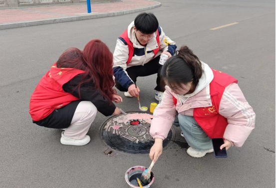 在太阳集团校公路上,土建志愿者们身穿红色志愿者马甲,手拿绘画工具,游走在校园之间,顺着他们的足迹走下去就会发现,校园中的井盖都变成了“景盖”,土建志愿者们以井盖为布、青春为笔让平日里并不引人注目的井盖从此刻开始披上了宣传“雷锋精神”的外衣,以绘画作品的形式向全校师生传递“学雷锋,好榜样”的青春正能量。